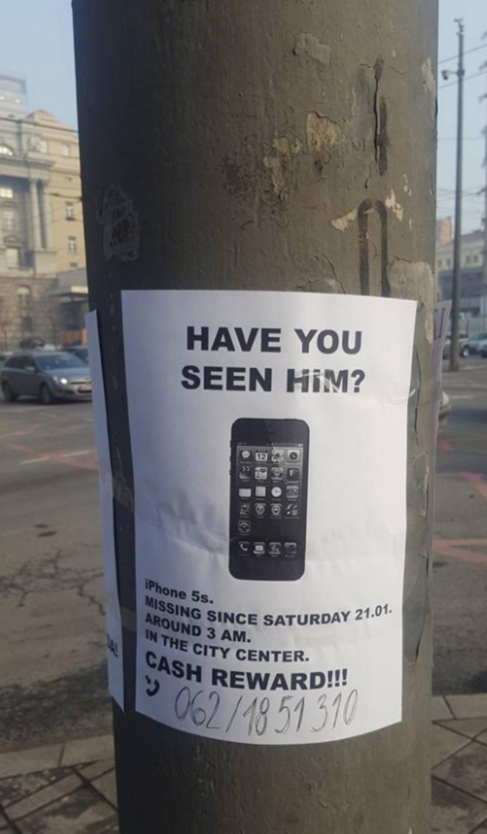- Da li ste ga videli? Nestao je telefon Ajfon 5s u subotu 21.01 u centru grada. Pronalazaču sledi nagrada, piše u oglasu.