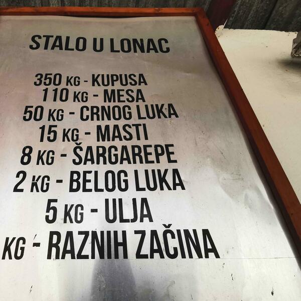 „U njega staje oko 380 kilograma kupusa, 125 kilograma mesa i dodaje se oko 60 kilograma crnog luka, 18 masti, šargarepe, beli luk i dodaje se oko pet kilograma raznih začina. Sve se to u ovaj veliki lonac ređa red po red, a onda sve zajedno krčka oko osam sati. Tako se dobija pravi svadbarski kupus iz srca Šumadije. Možda ima većih posuda na svetu, ali one se nalaze u muzejima, ne služe za spremanje hrane", kaže za RINU, majstor Milun Tošić.