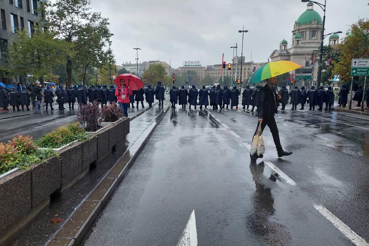 Policija je kolonu dočekala kordonom na polovini Beogradske ulice, zbog čega učesnici protesta menjaju rutu. Neki od njih pokušavaju da pronađu pukotine u kordonu policije i probiju se do Tašmajdana i dođu u sukob sa učesnicima Parade.