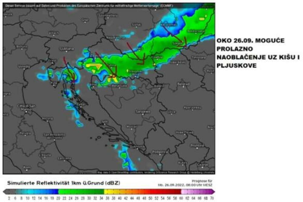 - Danas će se preko regiona premeštati frontalna zona koja donosi prolaznu kišu, ponegde na kratko i jaku, dok zatim sledi umereno razvedravanje uz moguće pljuskove. Vetar u okretanja na severni smer i na severu regiona na udare može biti i jak. Krajem dana i u toku noći pretežno vedro i hladno. Dnevni maksimum od +14 do +20 stepeni Celzijusa, a u toku noći samo od +7 do +14 stepeni Celzijusa, navodi Čubrilo.
