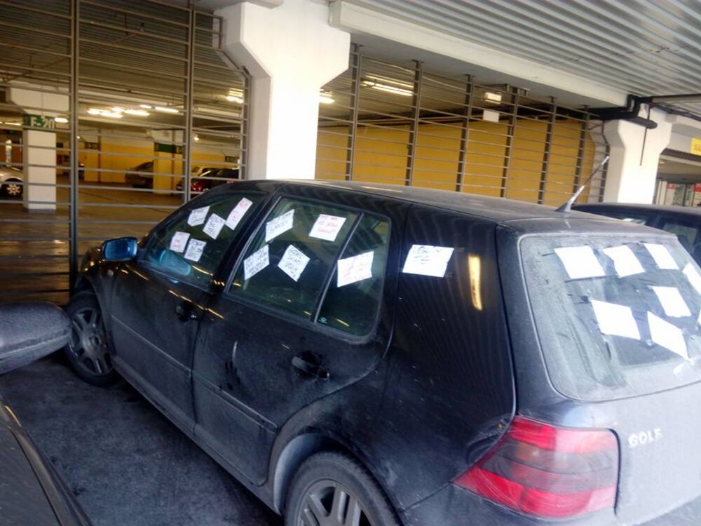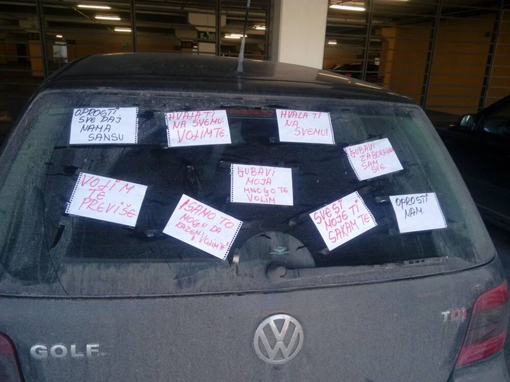 Zbog čega su se posvađali ne znamo, ali sudeći po onome što je na fotografiji, nešto je zgrešila, pa se svojski iscimala da mu na automobil nalepi papiriće sa ljubavnim porukama!