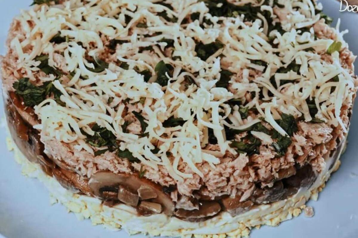 Na ulju propržite sitno seckan crni luk i pečurke, a jaja skuvajte. Uzmite obruč i stavite ga preko tacne, pa poređajte skuvana jaja koja ste prethodno izrendali. Zatim premažite kašikom majoneza, pa poređajte propržene pečurke sa crnim lukom i opet premažite majonezom. Nakon toga tunjevinu procedite i usitnite viljuškom, pa dodajte kašiku majoneza. Dobro promešajte i rasporedite kao treći sloj. Pospite seckanim peršun i rendanim sirom.