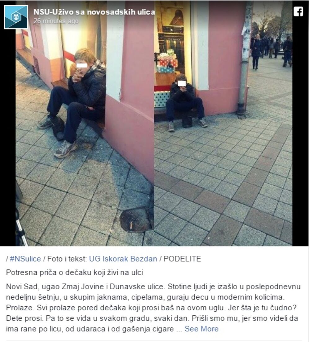 Na Fejsbuk profilu NSU, Uživo sa novosadskih ulica osvanuo je veoma potresan status o dečaku koji prosi. Međutim, pored toga što prosi, dečak ima rane po licu, zadobijene od udaraca i gašenja cigarete upravo na licu.