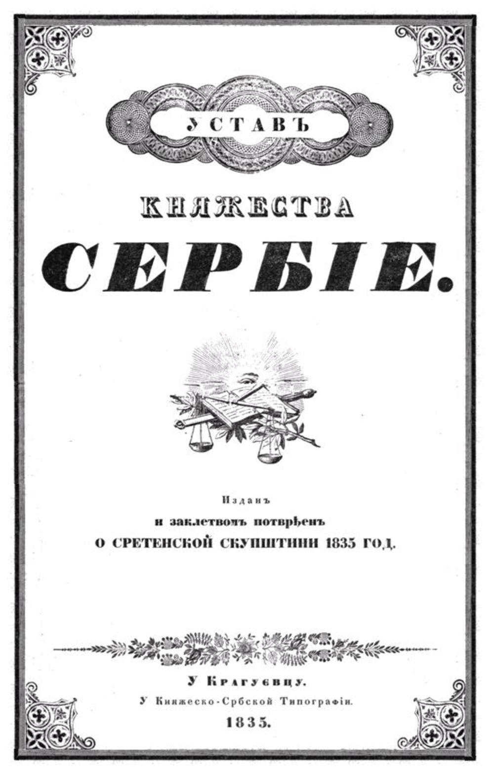 15. februar 1835. Skupština u Kragujevcu donela je Sretenjski ustav, prvi ustav Srbije, jedan od najmodernijih, najdemokratskijih i najliberalnijih ustava svog doba. Njime je u Srbiji ukinut feudalizam.
