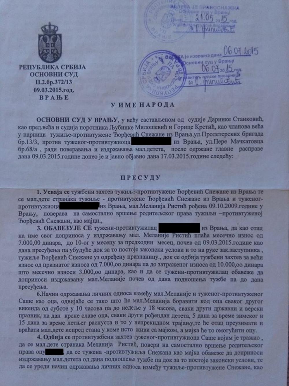 - Moj bivši suprug je trenutno u zatvoru jer nije poštovao odluku suda. Najpre je novčano kažnjen sa 50.000 dinara, zatim 80.000 i 150.000 dinara, a kako nije platio uhapsili su ga. Iako je on iza rešetaka, moja Melanija je i dalje kod njegovih roditelja - priča uznemireno Snežana.