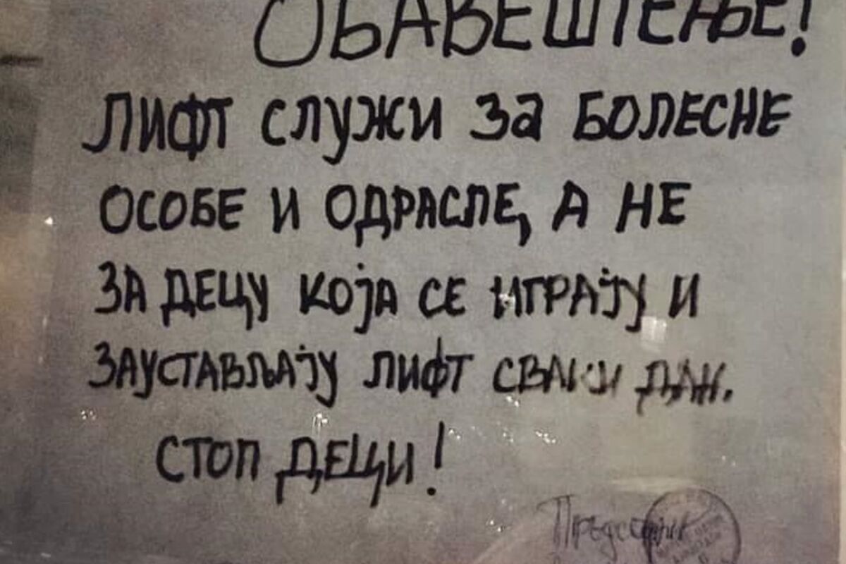 U njemu piše da lift u zgradi služi za bolesne osobe i odrasle, ali ne i za decu koja se igraju i zaustavljaju lift svaki dan. Ono što je svakako privuklo najviše pažnje je što na kraju oglasa piše "STOP DECI"!