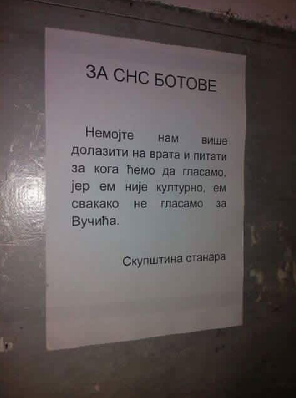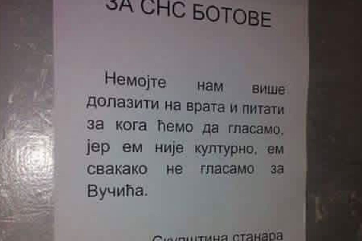 - Nemojte nam više dolaziti na vrata i pitati za koga ćemo da glasamo, jer em nije kulturno, em svakako ne glasamo za Vučića, piše u oglasu.