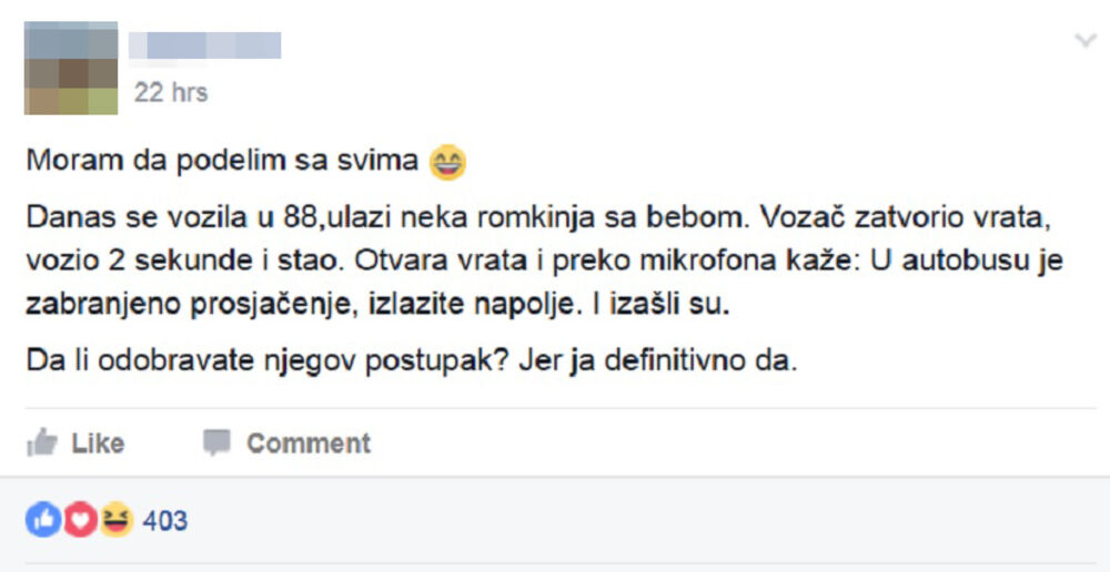 – Danas sam se vozila u 88, ulazi neka Romkinja sa bebom. Vozač zatvorio vrata, vozio 2 sekunde i stao. Otvara vrata i preko mikrofona kaže - U autobusu je zabranjeno prosjačenje, izlazite napolje. I izašli su – napisala je devojka i dodala da ona odobrava i podržava postupak šofera - Da li odobravate njegov postupak? Jer ja definitovno da!