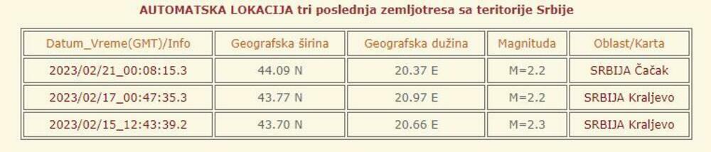 Aparati Seizmološkog zavoda Srbije registrovali su zemljotres na području Čačka, jačine 2,2 stepena po Rihterovoj skali.