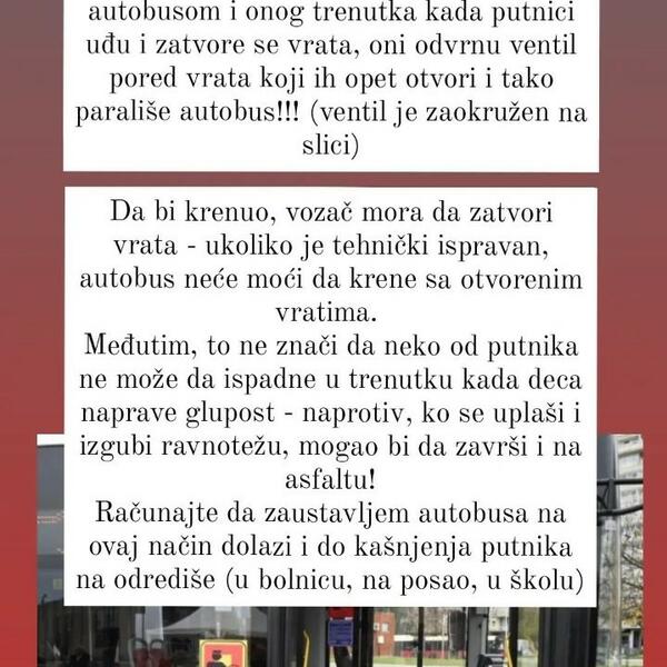Da bi krenuo, vozač mora da zatvori vrata - ukoliko je tehnički ispravan, autobus neće moći da krene sa otvorenim vratima. Međutim, to ne znači da neko od putnika ne može da ispadne u trenutku kada deca naprave glupost - naprotiv, ko se uplaši i izgubi ravnotežu, mogao bi da završi i na asfaltu! Računajte da zaustavljanjem autobusa na ovaj način dolazi i do kašnjenja putnika na odrdište (u bolnicu, na posao, u školu).