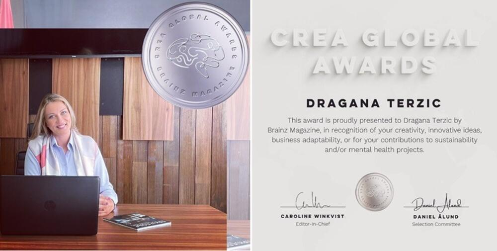 - U februaru sam nominovana za Brainz 500 Global nagradu, a pre nedelju dana saznala sam da sam među dobitnicima Crea Global Award 2023. Ova nagrada se svake godine dodeljuje onima koji su prepoznati po svom preduzetničkom uspehu, dostignućima i posvećenosti pomaganju drugima. U prethodnim godinama, neki od dobitnika bili su Marc Randolph, Oprah Winfrey, Jessica Alba, Mel Robbins i Leonardo DiCaprio. Ovo priznanje ima poseban značaj za mene i osećam se ponosno što sam deo ovog izuzetnog i inspirativnog društva”, kazala je za RINU Dragana Terzić.