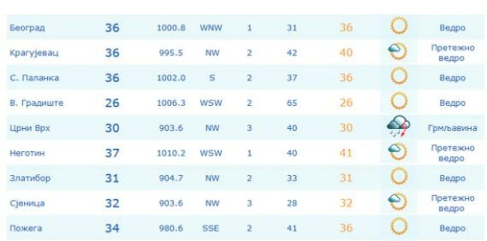 Posle Ćuprije i Negotina slede gradovi gde je izmereno 36 stepeni. Osim Novog Sada, tu su i Palić, Sombor, Zrenjanin, Kikinda, Banatski Karlovac, Loznica, Sremska Mitrovica, Beograd, Kragujevac, Smederevska Palanka i Niš.