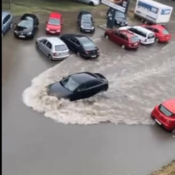 Čitave ulice su pod vodom, a automobili su se teško kretali. Voda koja se nakupila na trotoaru delovala je kao rečna bujica.