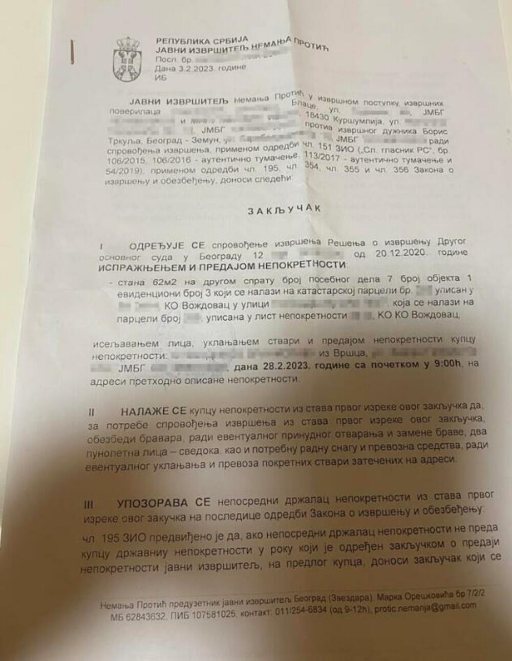 Mi smo ranije kontaktirali iz Nemanju Protića, javnog izvršitelja koji se bavi ovim slučajem i pitali zašto porodica ne može da ostane u stanu dok se postupak na sudu ne završi, konkretan odgovor nismo dobili, ali ga prenosimo u celosti: