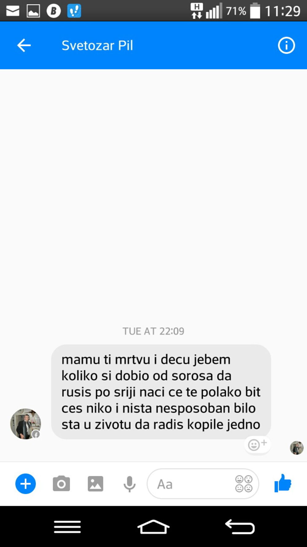 - Dragi prijatelji, ovo je još jedna u ‘riznici’ pretnji koje sam dobijao i dobijam, ovaj put preko FB-a, u inbox: "mamu ti mrtvu i decu jebem koliko si dobio od soroša da rušiš po sriji naći će te polako bit ćes niko i nista nesposoban bilo šta u životu da radiš kopile jedno’. Reč je o profilu pod imenom ‘Svetozar Pil.