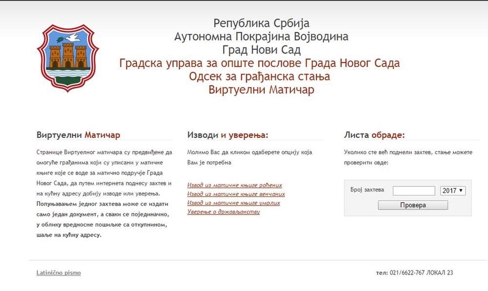 Stranica "Virtualni matičar" u Novom Sadu predviđena je da građanima koji su upisani u matične knjige koji se vode za matično područje grada Novog Sada, omogući da putem interneta podnesu zahtev i na kućnu adresu dobiju izvode ili uverenja.