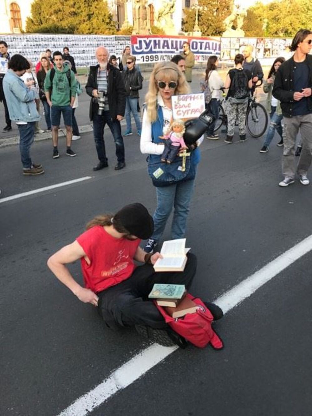 Među demonstrantima je i "lutkarka" Mira, kojoj društvo pravi lutka Boki.