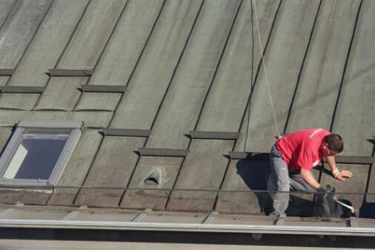 Naime, na fotografiji su dvojica radnika na krovu a jedan od njih, koji je u bizini ivice, zavezan je užetom koje pridržava drugi radnik.