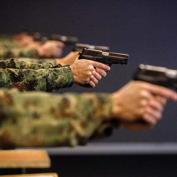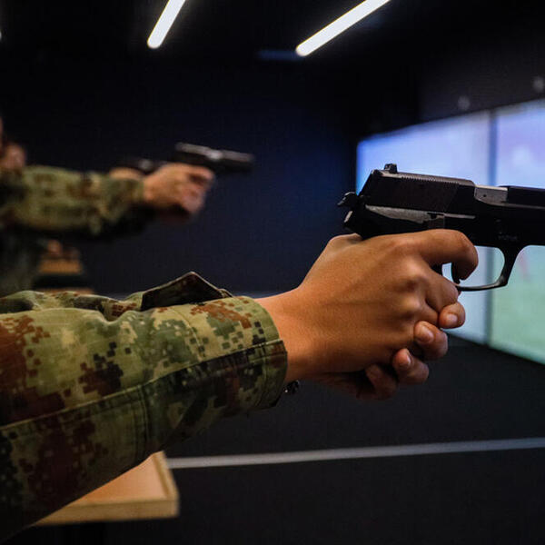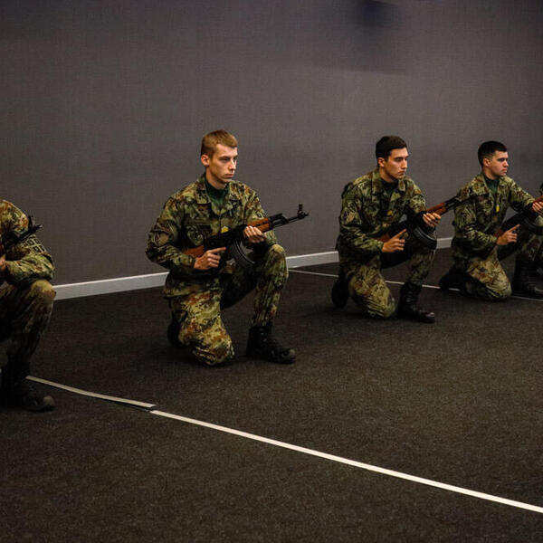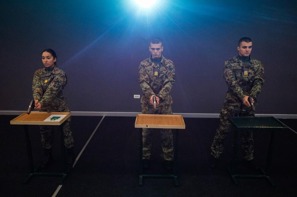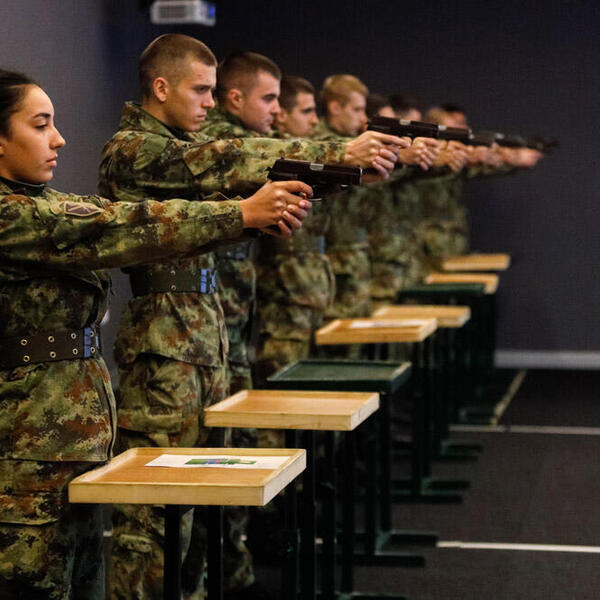 Virtuelna pištoljska streljana na Vojnoj akademiji najmodernija je i jedinstvena ne samo kod nas već i u regionu. Na komandu "pažnja" kadeti su u stojećem stavu spremni za gađanje pištoljem. Unutra polumrak. Ispred njih tri platna sa simulacijama meta. Ima i pokretnih i nepokretnih, a menjaju se čak i vremenske prilike. Slika kao realna.