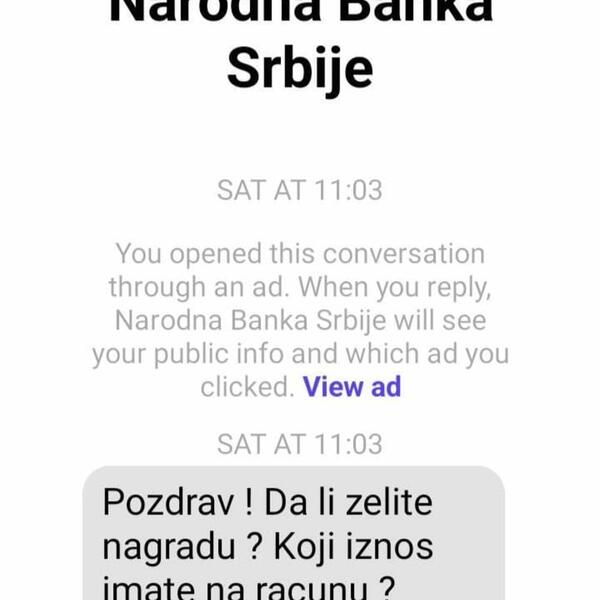 Prevaranti su na društvenim mrežama napravili lažni profil pod nazivom "Narodna banka Srbije". Oni najpre pošalju ljudima poruku da li žele da ostvare bonus, a postave pitanje i o trenutnom stanju na računu.