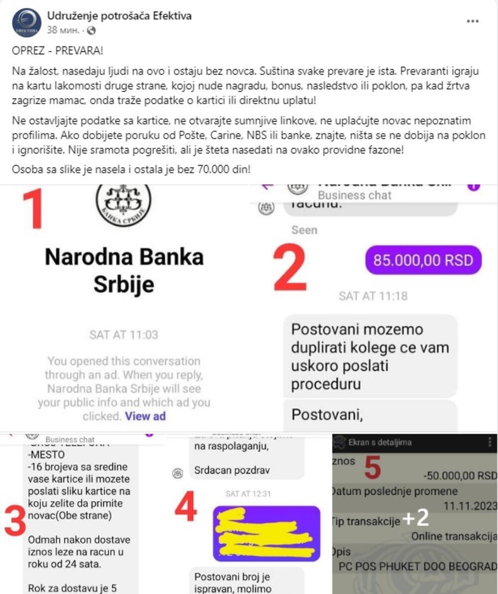 - Nažalost, nasedaju ljudi na ovo i ostaju bez novca. Suština svake prevare je ista. Prevaranti igraju na kartu lakomosti druge strane, kojoj nude nagradu, bonus, nasledstvo ili poklon, pa kad žrtva zagrize mamac, onda traže podatke o kartici ili direktnu uplatu! - upozorava na svom profilu udruženje "Efektiva".