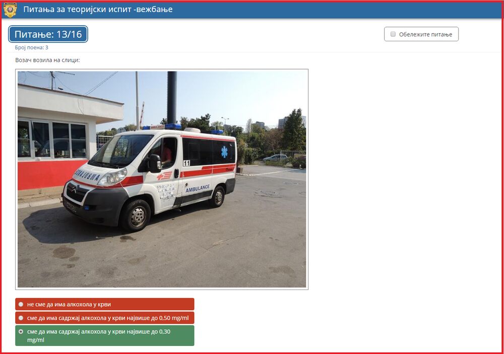 Naime, na polaganju teorijskog dela ispita stoji pitanje da li vozač vozila (vozilo Hitne pomoći) sme da ima alkohola u krvi: