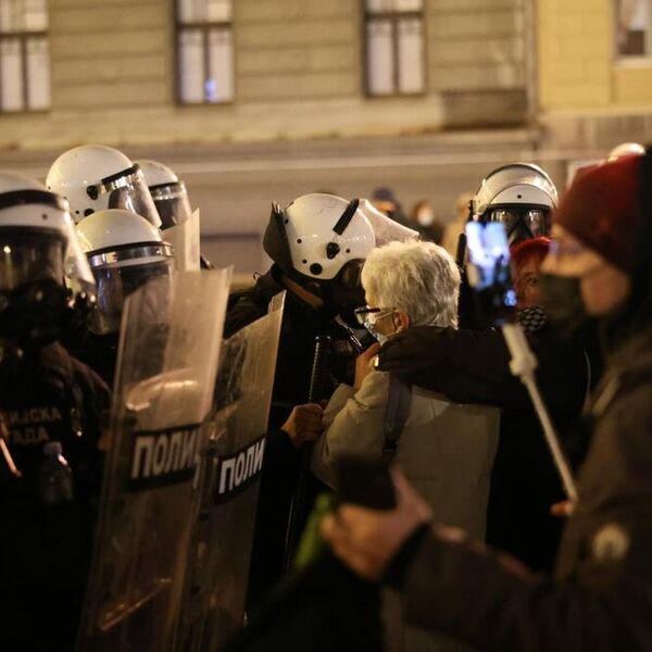 Podsećamo, nekoliko stotina građana okupilo se večeras na poziv prestavnika liste "Srbija protiv nasilja", po sedmi put ispred zgrade stare skupštine, gde se nalazi sedište Republičke izborne komisije (RIK).