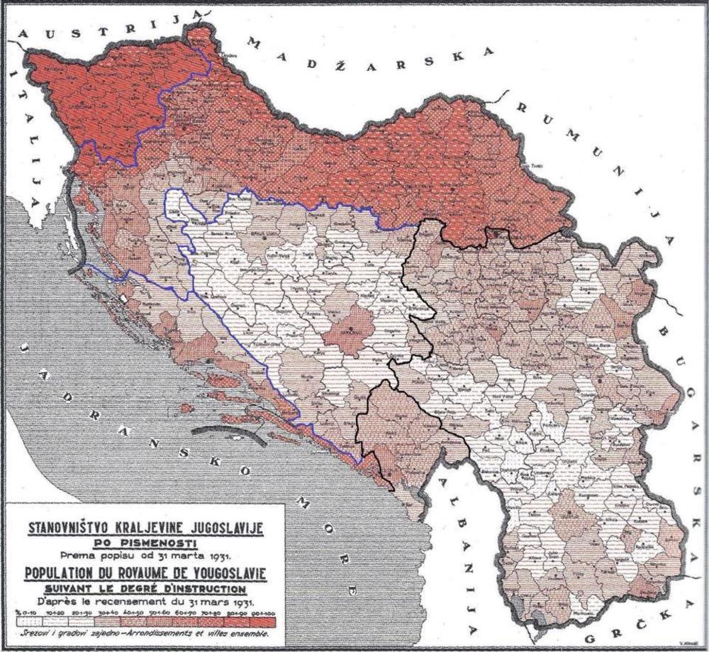 Na internetu se pojavila mapa pismenosti kraljevine Jugoslavije, iz 1931. godine, na kojoj možemo da vidimo koji krajevi su imali najveći, a koji najmanji procenat pismenih ljudi.