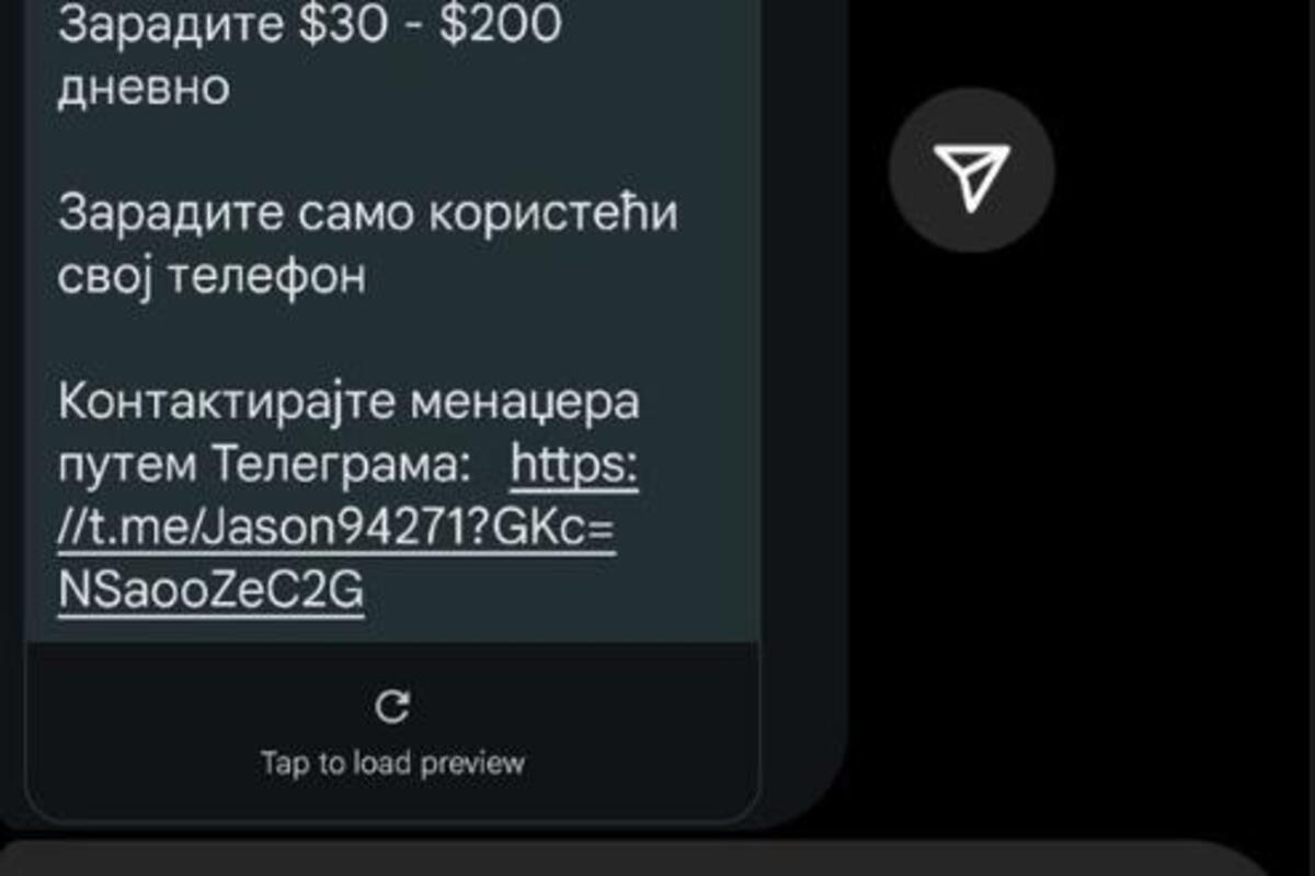 Naime, u poruci se radi oponudi za posao, a da bi do njega došlo neophodno je kliknuti link koji navodno vodi do telegram grupe sa menadžerom firme.
