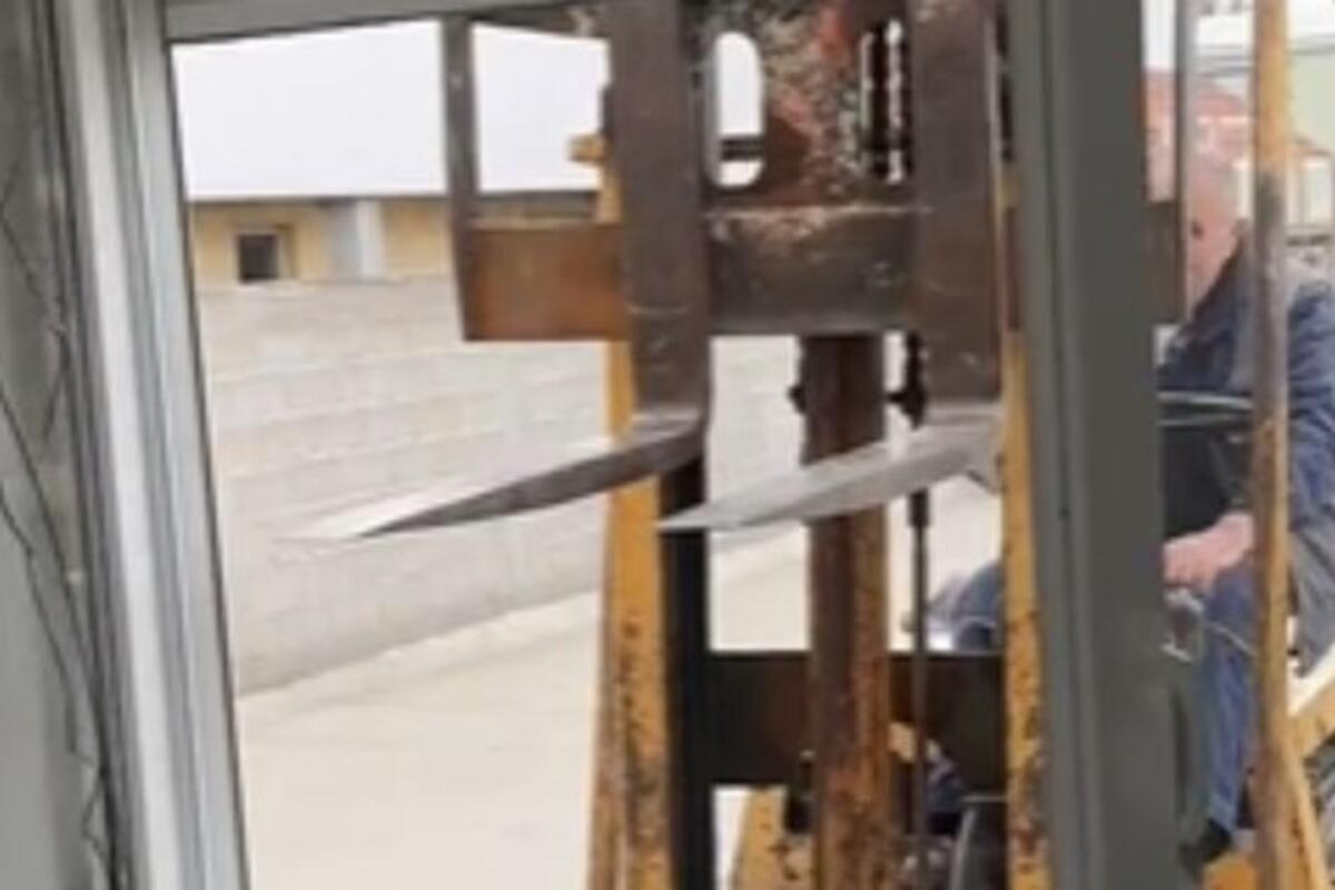 U videu radnik pali viljuškar i ide direktno da slomi prozore na kućici