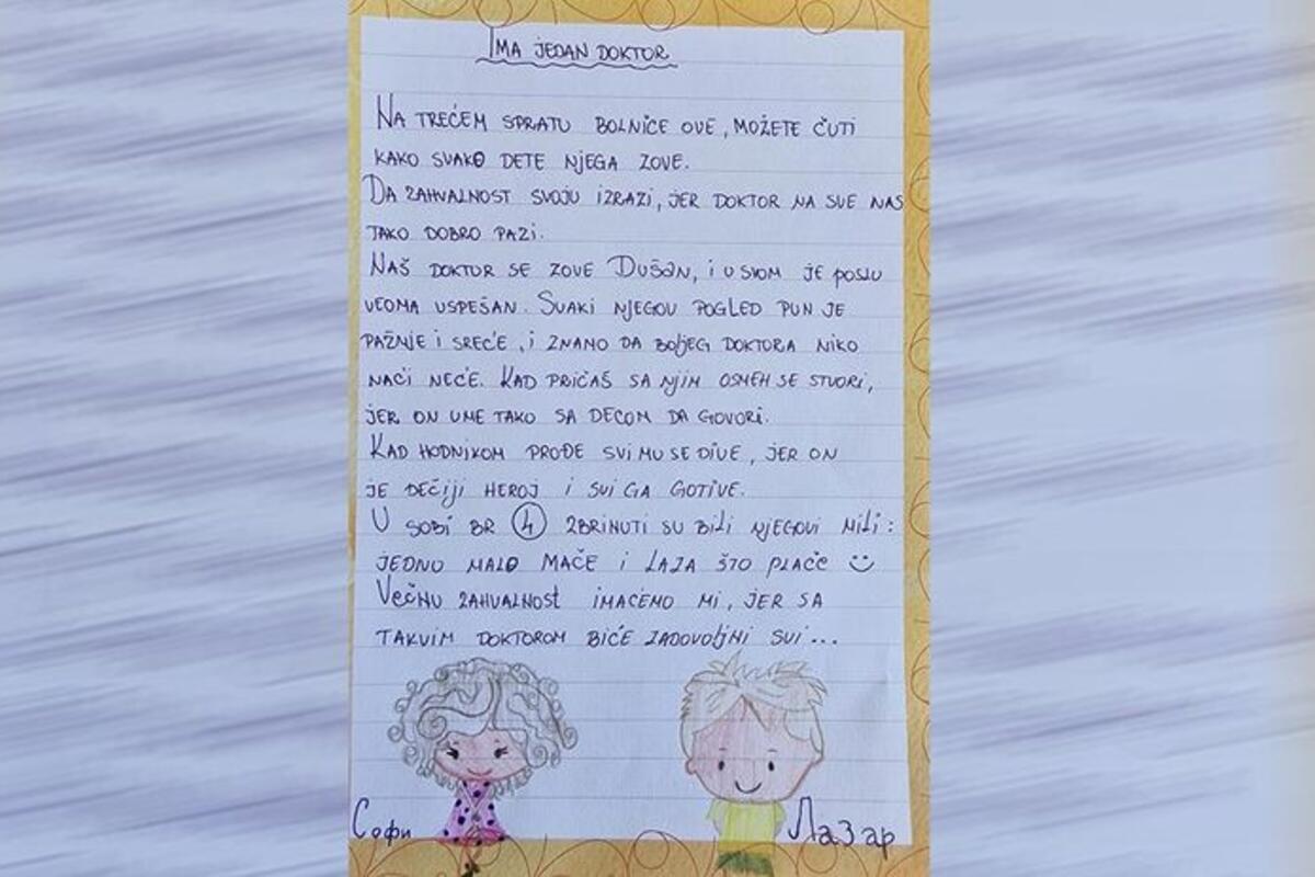 "Sofija ima devet godina a Lazar šest godina, operisani su prošle nedelje i dele istu sobu u bolnici. Zajedno su napisali pismo koje ću uramiti i čuvati u kancelariji.