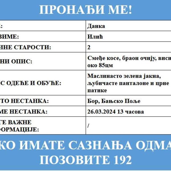 Dvogodišnja Danka Ilić nestala je danas oko 13.45 sati u Banjskom polju kod Bora, a u potragu za devojčicom uključile su se sve dežurne službe MUP.