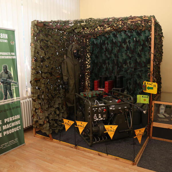- U ovom kabinetu grupa profesionalnih vojnih lica realizuje obuku iz domena dekontaminacije sa težištem na ponavljanju teorijskih sadržaja o osnovama dekontaminacije, vrstama, metodama i načelima i ponavljanju namene, karakteristika ličnih i grupnih pribora za dekontaminaciju i autoinjektora. Tu su savremeni uređaji italijanske proizvodnje za dekontaminaciju osetljive opreme i uređaj za dekontaminaciju žive sile i tehničkih sredstava koji može vršiti dekontaminaciju specijalnim materijama za dekontaminaciju i pregrejanom vodenom parom.