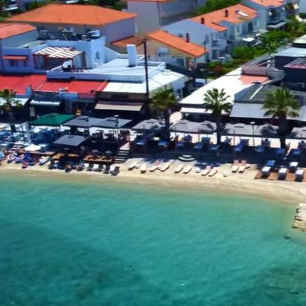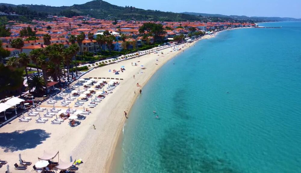 3 kilometara duga plaža od sitnozrnog peska, dovoljno široka da primi sve posetioce i ima plavu zastavicu. Krasi je čisto more i veličanstveni pogled na Atos. Celom dužinom promenade su kafići,traverne i restorani. Povremeno su talasi prisutni pa možete obilaziti plaže koje su relativno blizu.