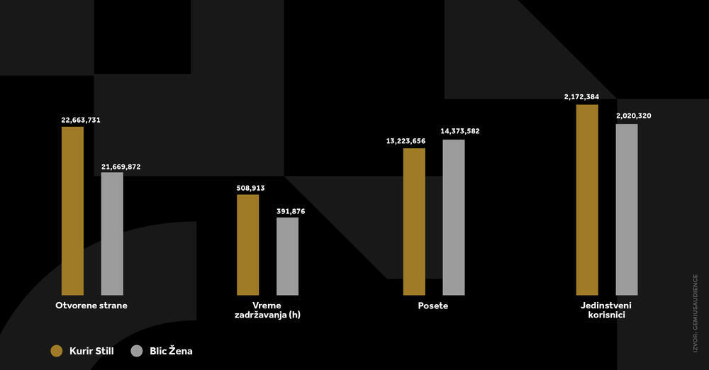 Kada je reč o ženskim portalima, Gemiusovi podaci pokazuju da je Kurir Stil pozicioniran kao vodeći sajt u Srbiji. U maju je čak 2.17 miliona jedinstvenih korisnika posetilo Stil, što je 152,064 korisnika više od drugopasirane Blic Žene. U prilog tvrdnji da je Stil potpuno preuzeo primat u ovoj kategoriji, govori i činjenica da je Stil imao 993 hiljade, odnosno 5% više otvorenih strana od drugoplasiranog ženskog sajta.