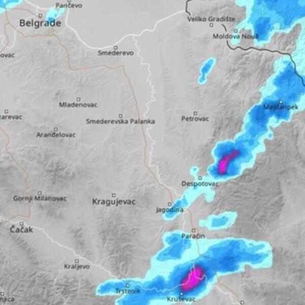 Mapa prikazuje da će nakon 16 sati najjači udar biti u Kruševcu i kod Despotovca.