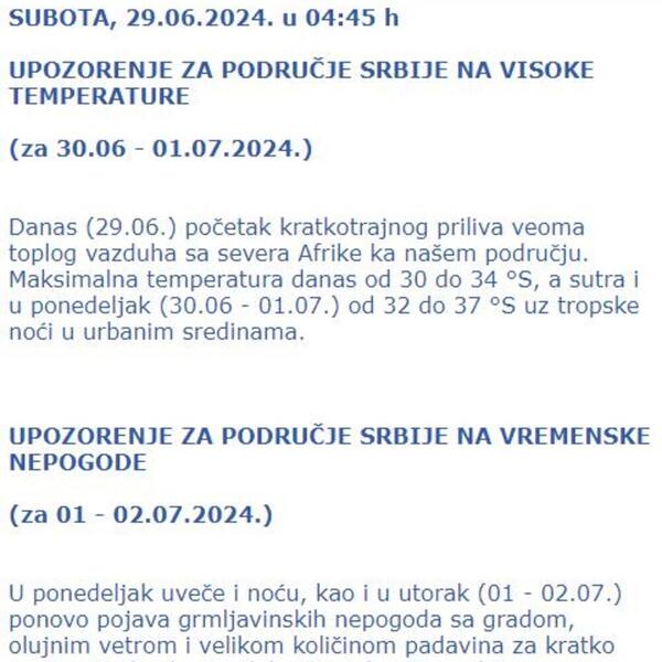 "Danas početak kratkotrajnog priliva veoma toplog vazduha sa severa Afrike ka našem području. Maksimalna temperatura danas od 30 do 34 stepena, a sutra i u ponedelјak od 32 do 37 uz tropske noći u urbanim sredinama.