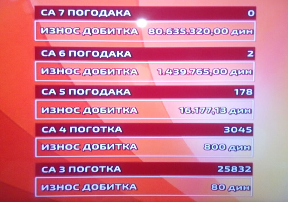 Nažalost nije bilo srećnika koji je osvojio sedmicu koja je iznosila čak 80 miliona dinara.