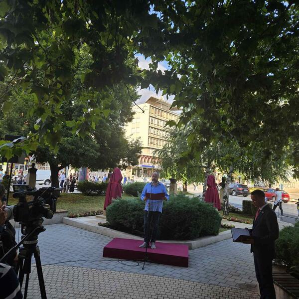 - Neki od njegovih poslednjih koraka su ponovo prošetali daskama ove scene. Da je Bog hteo drugačije, sigurno bi ih napravio za još dva života, pritom usmeravajući i inspirišući one koji tek dolaze. Zato danas na ovom trgu i u ovoj leji, simbolično stavljamo Marka među one koje je toliko voleo i koji su njega inspirisali i isto tako simbolično da bude onde gde je oduvek pripadao – U svom rodnom Kruševcu među svojim građanima Kruševljanima, među svojim kruševačkim kolegama glumcima i uz svoje Kruševačko pozorište - rekao je on, i dodao:
