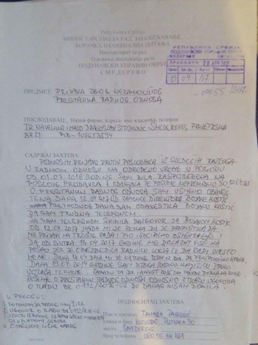Naime, kako tvrdi ova devojka, do pre nekoliko dana bila je zaposlena u trgovinskoj radnji "Dragoslav Stojković", gde je zvanično radila do 12. aprila 2017. godine.