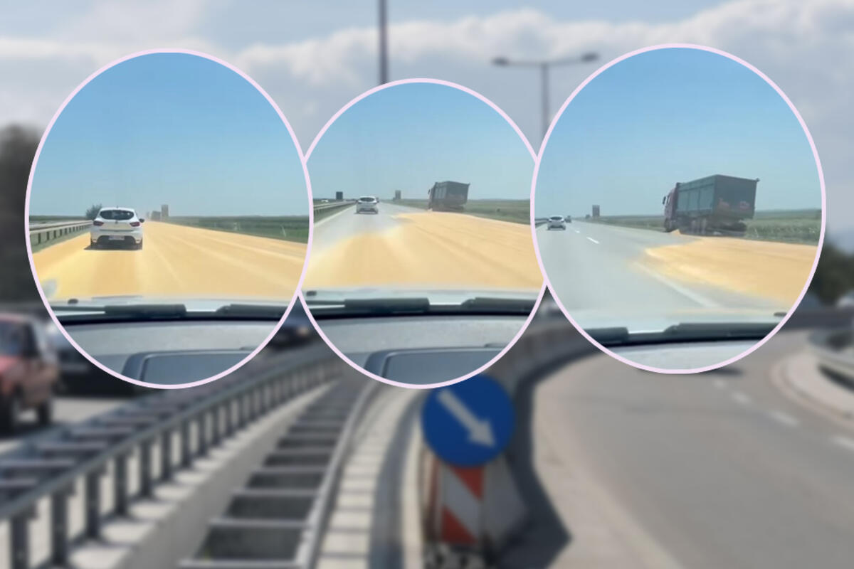 Ne zna se kako se došlo do ove nezgode, ali vidimo ogromne količine pšenice koja je zasula ceo put.