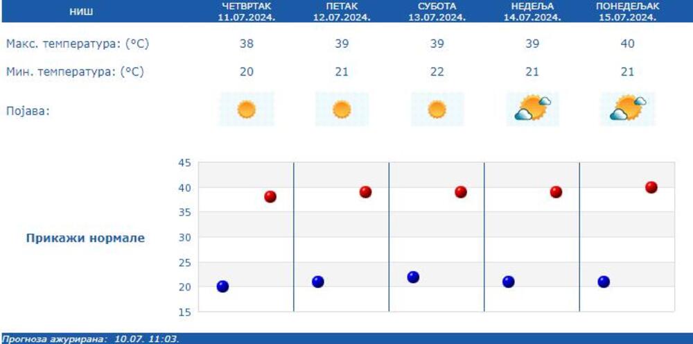 • u Nišu, u nedelju 14. jula biće pretežno sunčano i 39 stepeni, u ponedeljak temperatura vazduha ide i do 40 stepeni