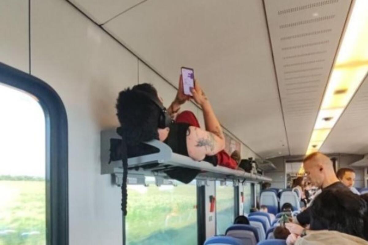 Naime, na Instagram stranici SerbiaLive Beograd vidi se kako mladić leži u delu za prtljag, iznad sedišta u vozu.