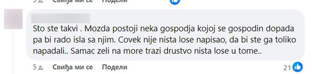 "Što ste takvi? Možda postoji neka gospođa kojoj se gospodin dopada pa bi rado išla sa njim. Čovek nije ništa loše napisao da biste ga toliko napadali. Samac želi na more, traži društvo, nema ništa loše u tome", napisala je jedna gospođa, a nju je podržao i sam autor objave "Lepo si rekla, ja ne vidim ništa loše u tome".