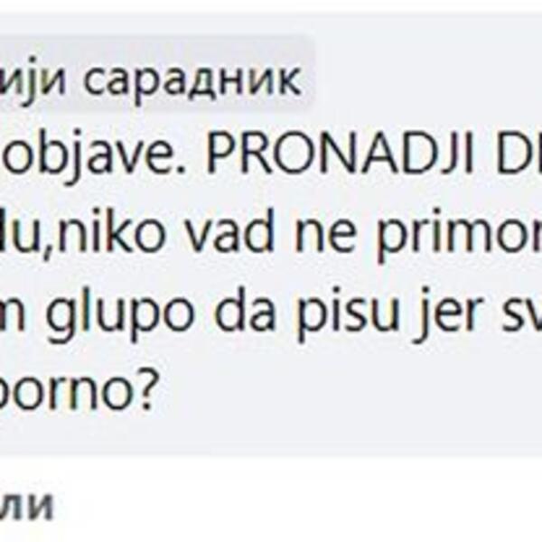 "Jedina dobra stvar ove grupe su informacije. Mimo toga, ova grupa je slika naše zemlje. Čovek je postavio kulturno pitanje, ali izgleda da je svuda hobi ismevanje i pametovanje, posebno muškog roda kada pokušava da pobedi samoću. Imam osećaj da nam je nacija na nivou vrtića, da se nije mnogo napredovalo. Čast izuzecima. Srećno gospodinu", napisao je on.