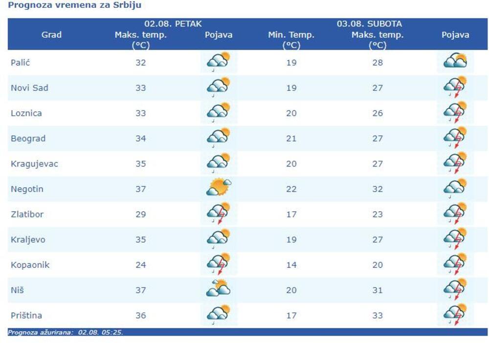 "Danas promenlјivo uz smenu sunčanih i oblačnih intervala i lokalne pojave kratkotrajne kiše i plјuskova s grmlјavinom. Ponegde se očekuje i pojava sugradice i grada, sa najvećom verovatnoćom na jugozapadu Srbije. Maksimalna temperatura od 32 na severozapadu do 37 stepeni na jugu i istoku Srbije.