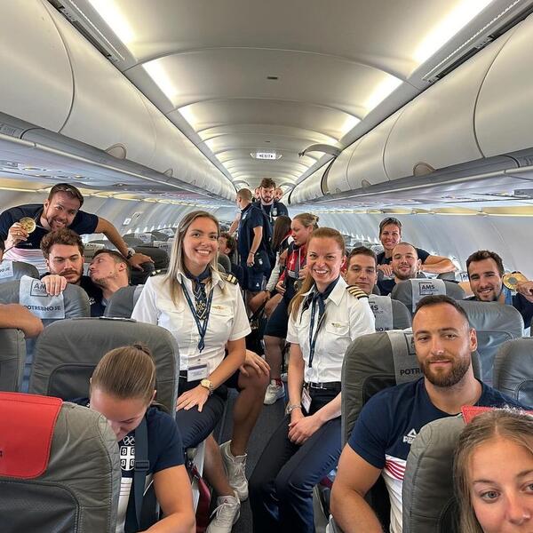 Po sletanju, zajednički snimak i sa letačkom posadom aviona - jer iz razumljivih razloga tokom leta to nije baš moguće napraviti, neko mora da bude i u kokpitu. Na snimku, uz srpske olimpijce, dve šarmantne mlade dame u uniformama Air Serbia, jedna sa četiri crte na epoletama, a druga sa dve.
