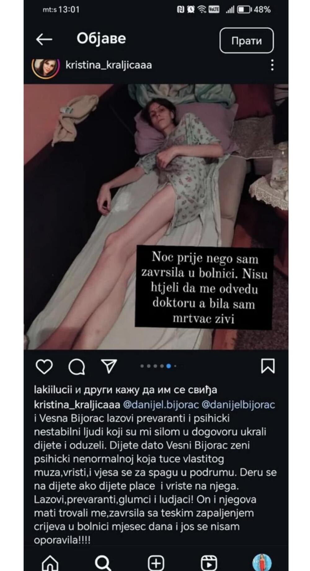 Kristina, koja je sa Danetom na planini živela nekoliko godina optužila je na društvenim mrežama i u medijima Daneta i njegovu majku Vesnu da su je zlostavljali i trovali, pa je sa teškom upalom creva završila u bolnici.