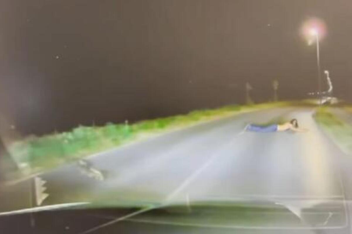 Na početku, nije se moglo raspoznati o čemu se radi. Ipak, kada se vozač približio, kamera je zabeležila muškarca koji leži nasred puta!