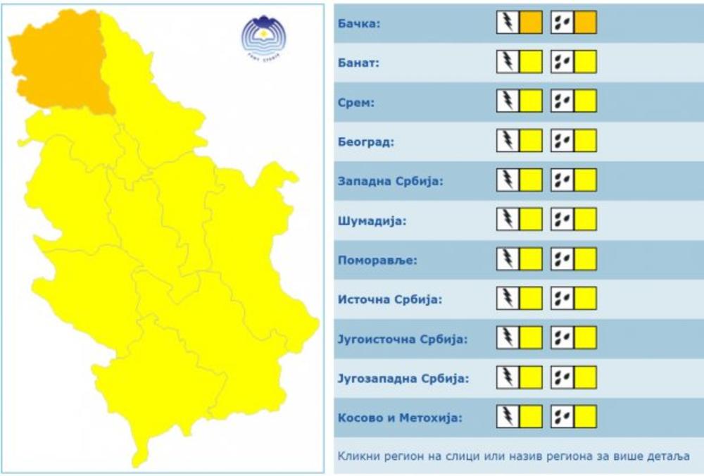 Ovo upozorenje će važiti i za sutra i odnosiće se na celu Srbiju. Ponegde će doći do kratkotrajnih nepogoda sa obilnijim padavinama i gradom, a vetar će u većini krajeva biti slab,na severu i umeren, zapadni, severozapadni, saopštio je Republički hidrometeorosloški zavod.